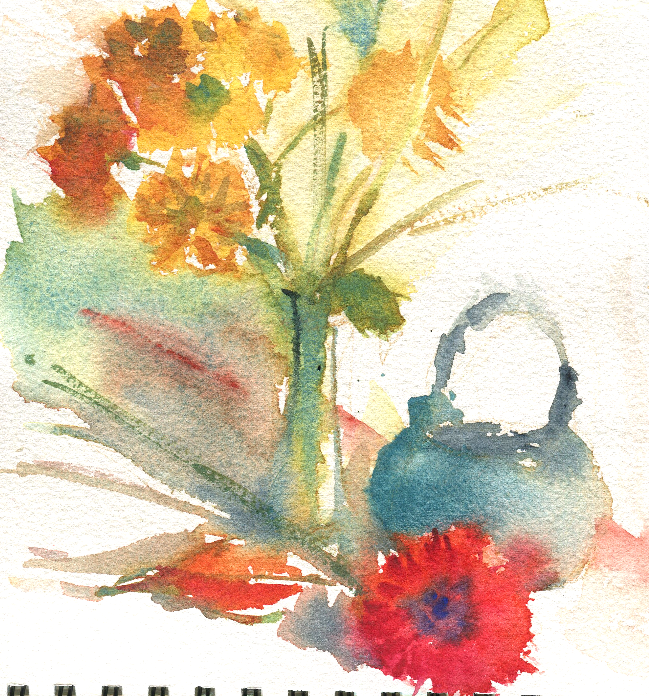 I wanted to do a more careful study of the teal tea pot next, so I setup a still life with just the teapot and I added the orange bud for some interest. Again, I wasn't able to achieve much value contrast, and I didn't wait for the wet areas to dry before going back in there ... but still I like the effects that achieved and how the whole composition looks.
